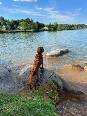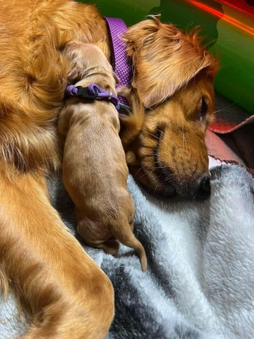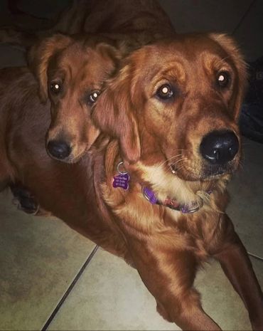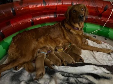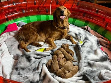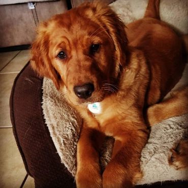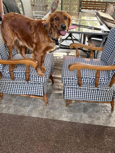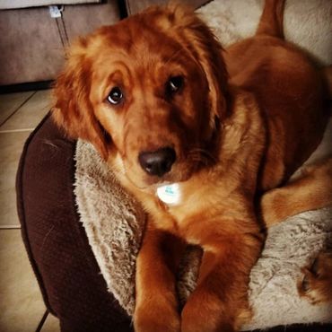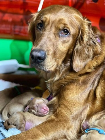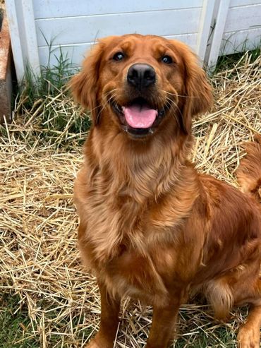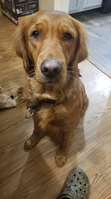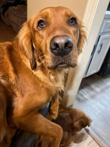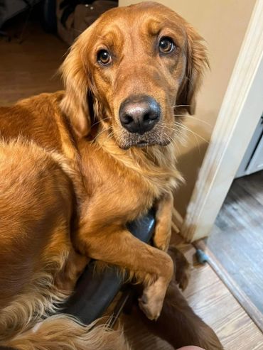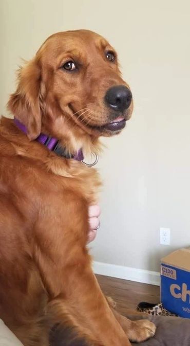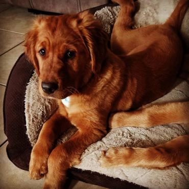 “Baby Horse” Our darkest Golden Retriever. Darci got her nickname Baby Horse as a young pup because she is as fast as a Mustang and a total work horse. Her on and off switch is unmatched. This girl is ready to go and also ready to cuddle. She offers companionship on any type of activity level. She is the easiest Dog we have ever trained and she impresses everyone she meets. She is vocal and you’d swear she is having full on conversations with you. She loves to swim, gets along with every Dog she meets and has proven to be a phenomenal mother. Darci LOVES to go to the movie theaters. She steals everyones heart that she meets.