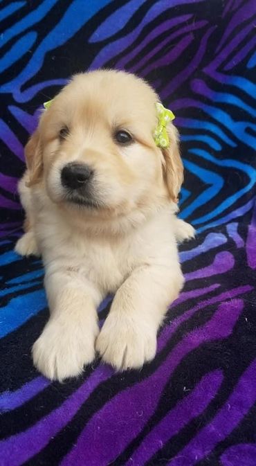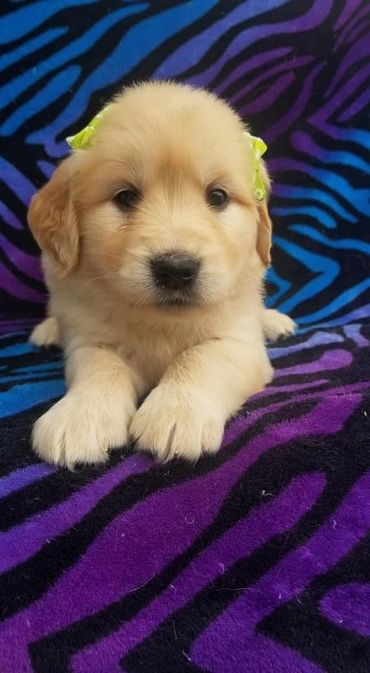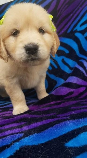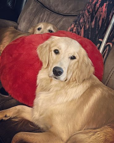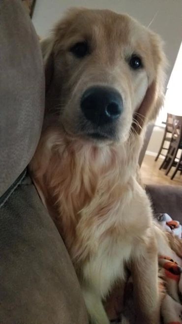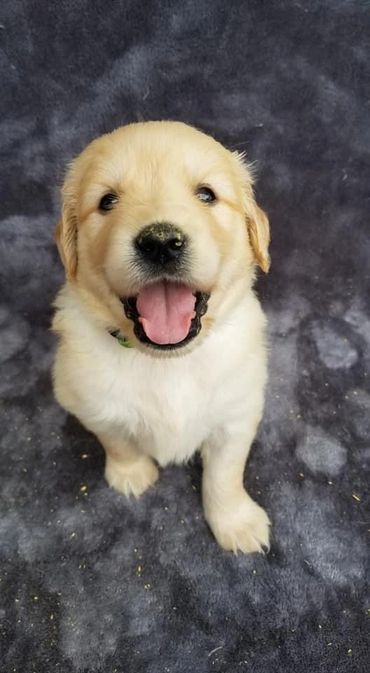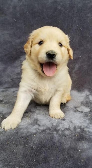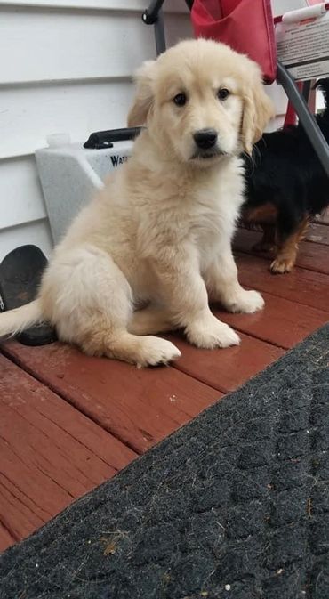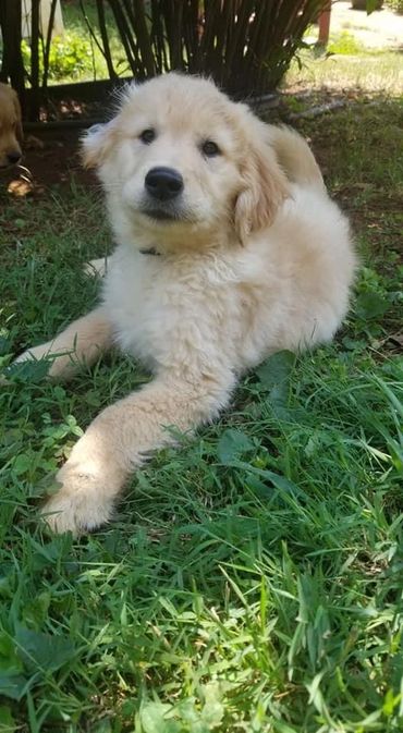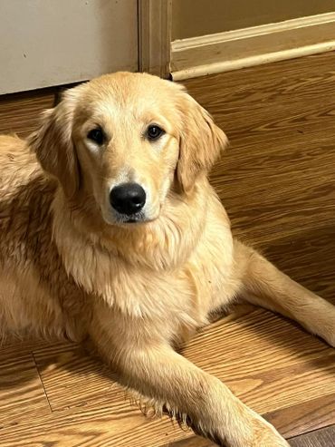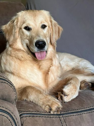 Lola was born and raised in our home. She is a Oakley x Gunner pup and our only keeper from all of their litters. We call her “Wolf Girl” because she just like her Mama leads the pack and keeps everyone in line. Lola like her dad doesn’t realize her own size and is a total lap Dog! She loves to swim and hike but will gladly chill on the couch with her humans and be perfectly content. She is our lightest golden currently.